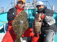 で上がってきたのは正真正銘のヒラメ。サイズは2,14kgをキャッチ。ん〜ホンと嬉しいね!